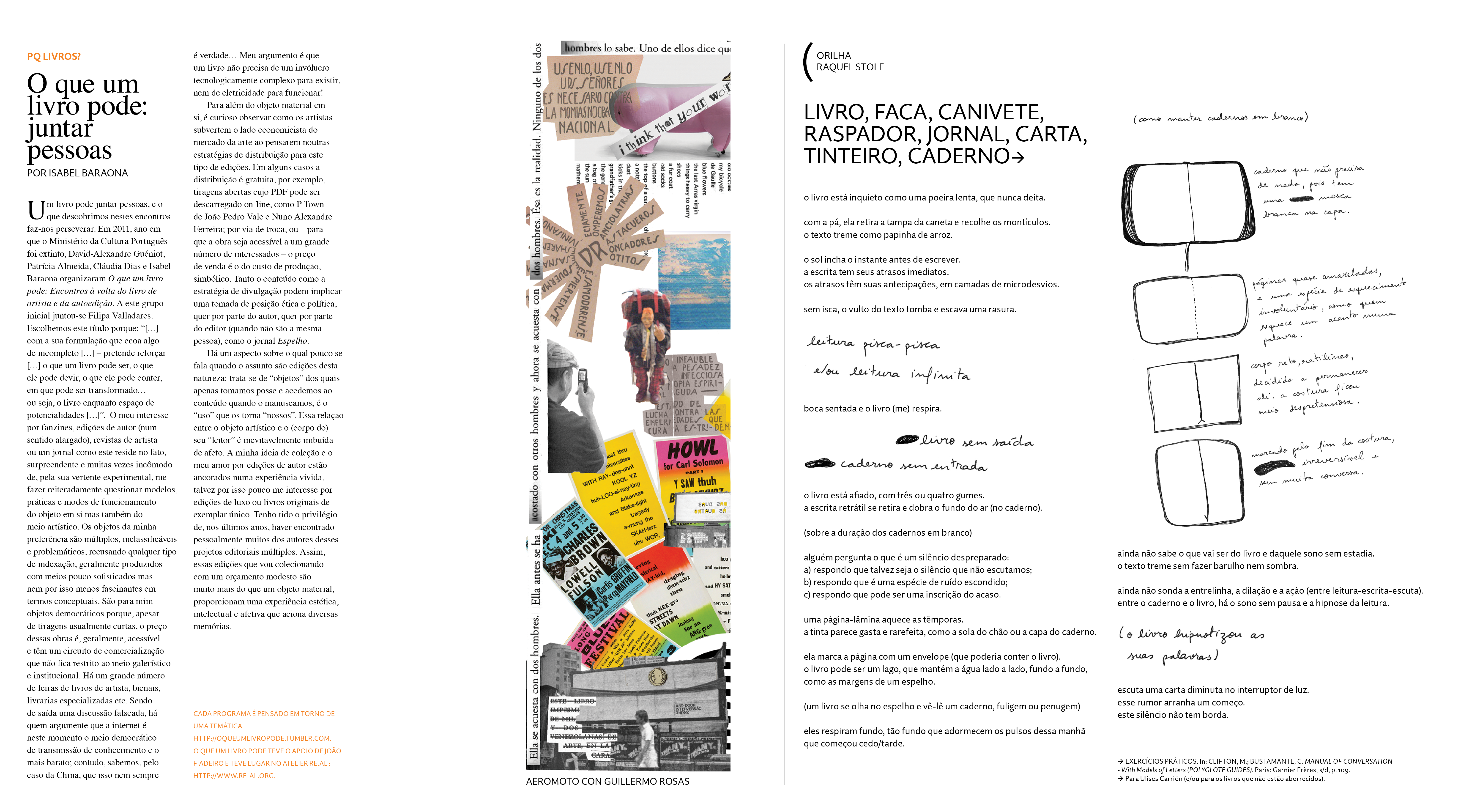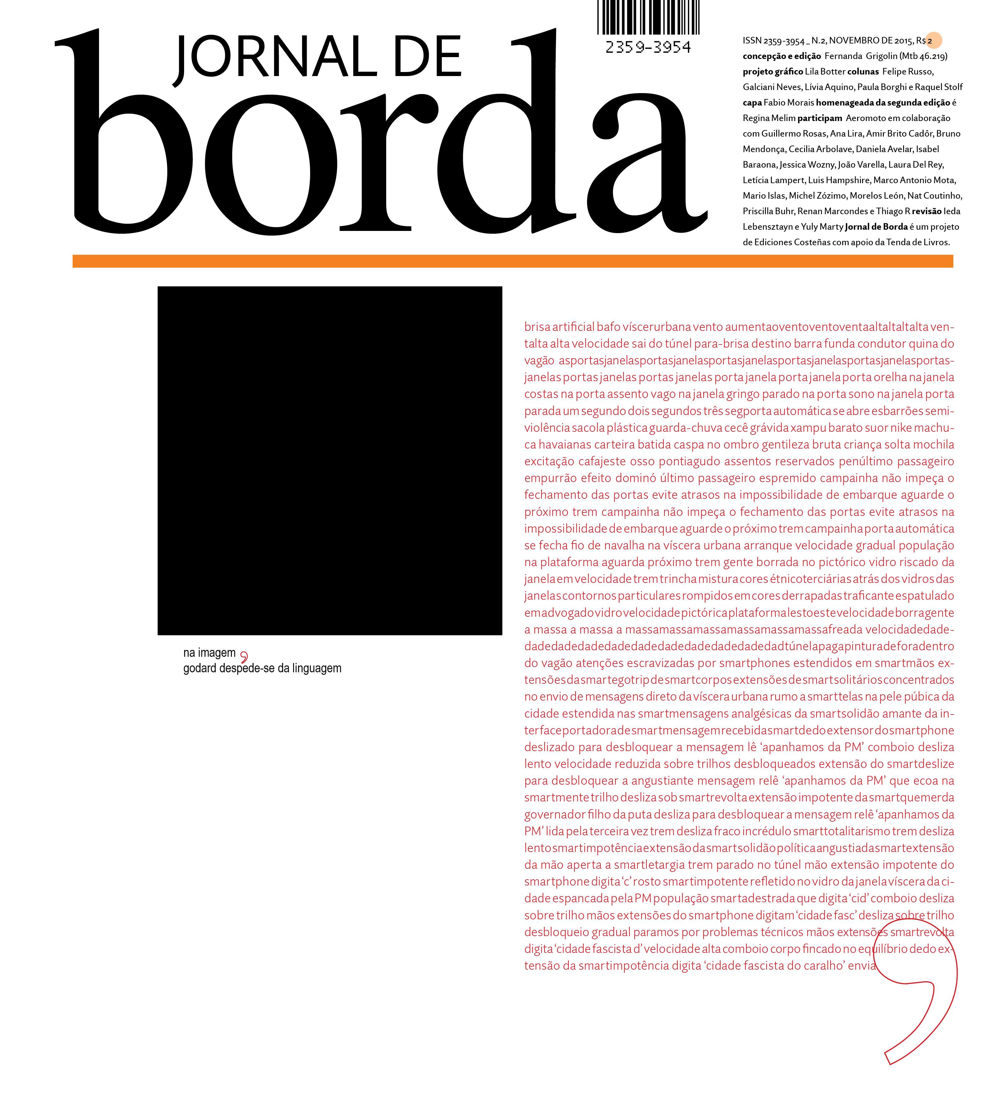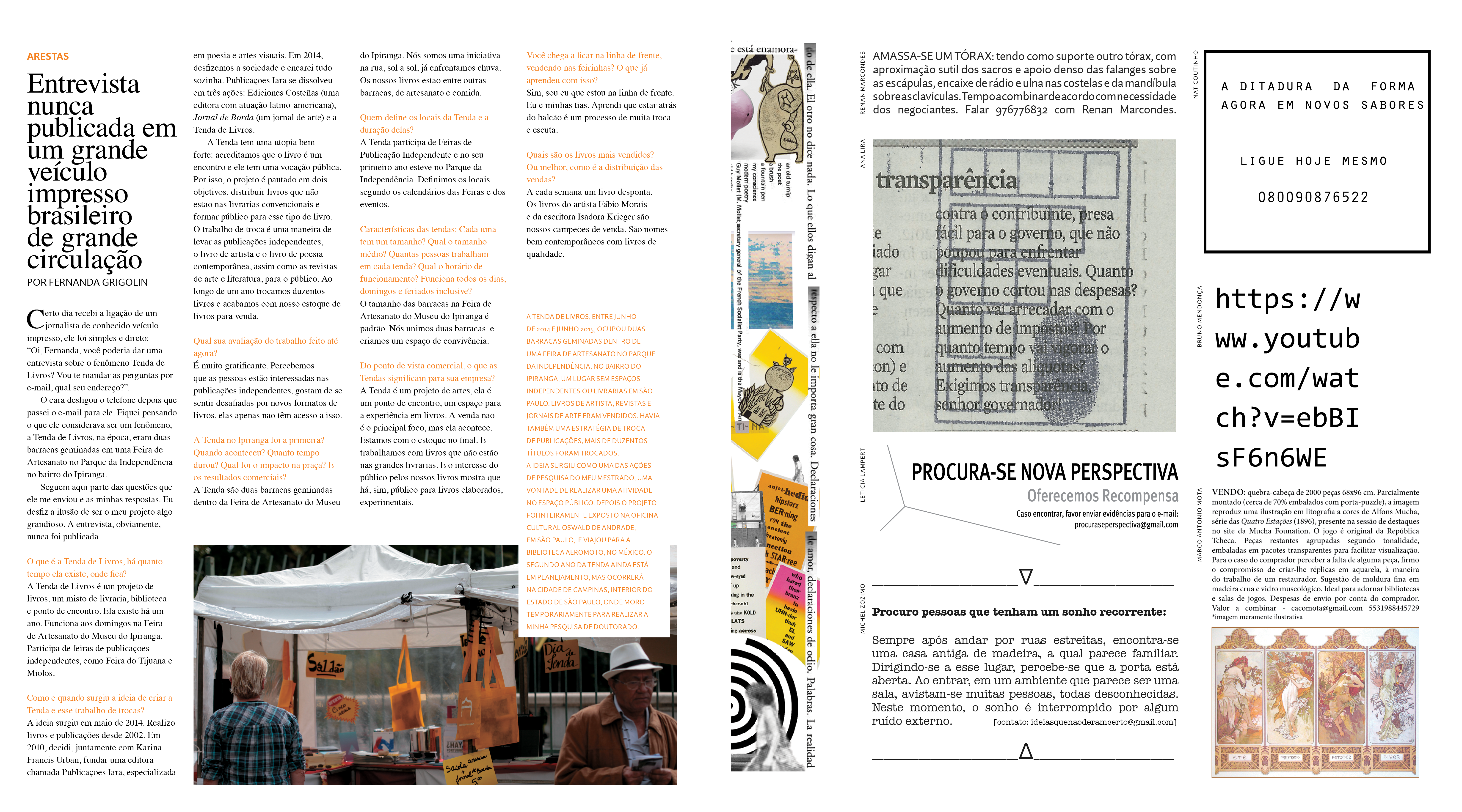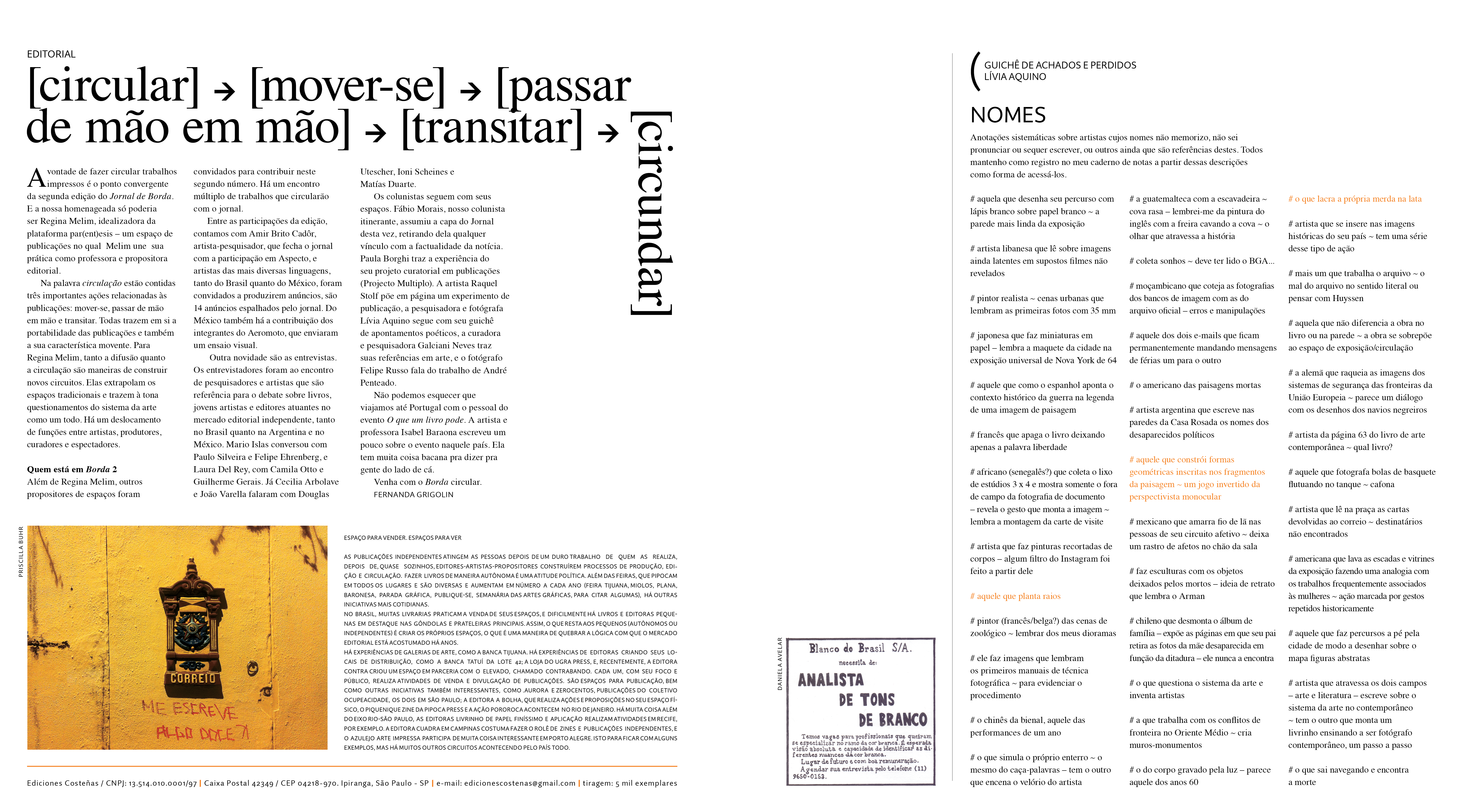 A segunda edição é de 16 páginas e conta com contribuições do Brasil, México e Argentina. Artistas das mais diversas linguagens foram convidados a produzirem anúncios, são 14 anúncios espalhados pelo jornal. A homenageada da edição é Regina Melim, e Amir Brito Cadôr fecha com um trabalho na última página do jornal. Outra novidade são as entrevistas. Os entrevistadores foram ao encontro de pesquisadores e artistas que são referência para o debate sobre livros, jovens artistas e editores atuantes no mercado editorial independente, tanto no Brasil quanto na Argentina e no México. Mario Islas conversou com Paulo Silveira e Felipe Ehrenberg e Laura del Rey, com Camila Otto e Guilherme Gerais. Já Cecilia Arbolave e João Varella falaram com Douglas Utescher, Ioni Scheines e Matías Duarte. Os colunistas seguem com seus espaços. Fábio Morais, nosso colunista itinerante, assumiu a capa do Jornal desta vez, retirando dela qualquer vínculo com a factualidade da notícia. Paula Borghi traz a experiência do seu projeto curatorial em publicações (Projecto Multiplo). A artista Raquel Stolf põe em página um experimento de publicação, a pesquisadora e fotógrafa Lívia Aquino segue com seu guichê de apontamentos poéticos, a curadora e pesquisadora Galciani Neves traz suas referências em arte, e o fotógrafo Felipe Russo fala do trabalho de André Penteado. Não podemos esquecer que viajamos até Portugal com o pessoal do evento O que um livro pode. A artista e professora Isabel Baraona escreveu um pouco sobre o evento naquele país. Ela tem muita coisa bacana pra dizer pra gente do lado de cá. [Compre a versão impressa aqui].