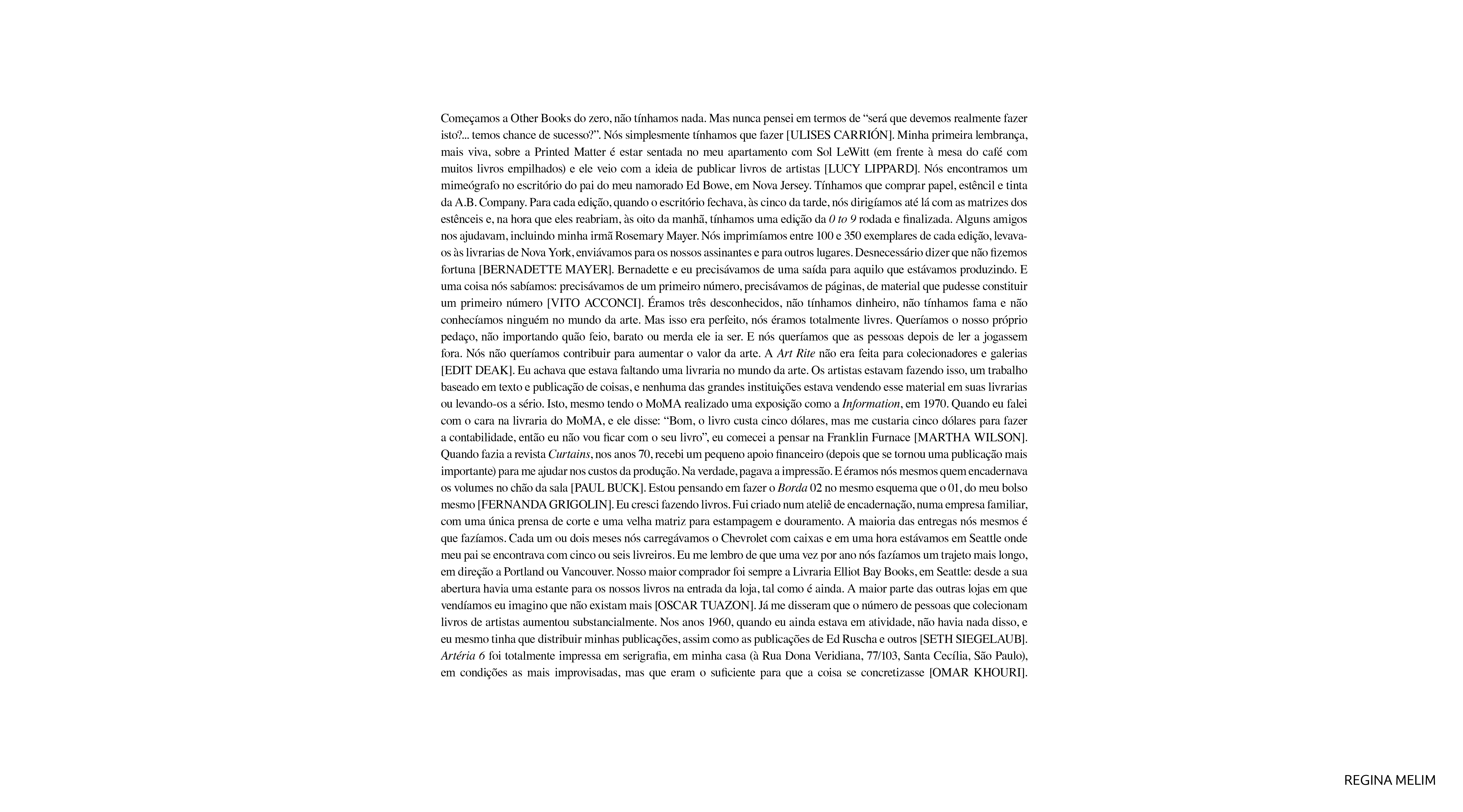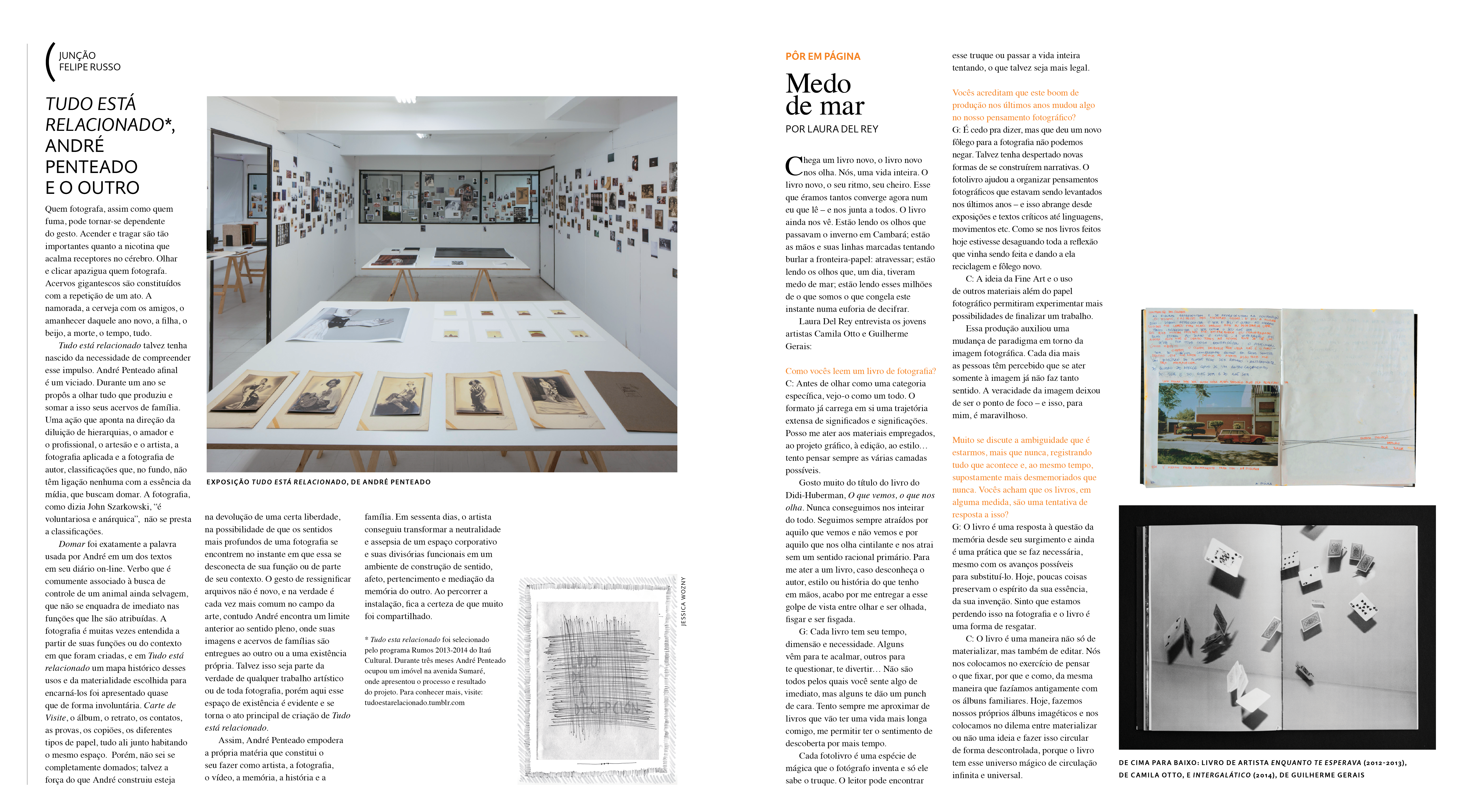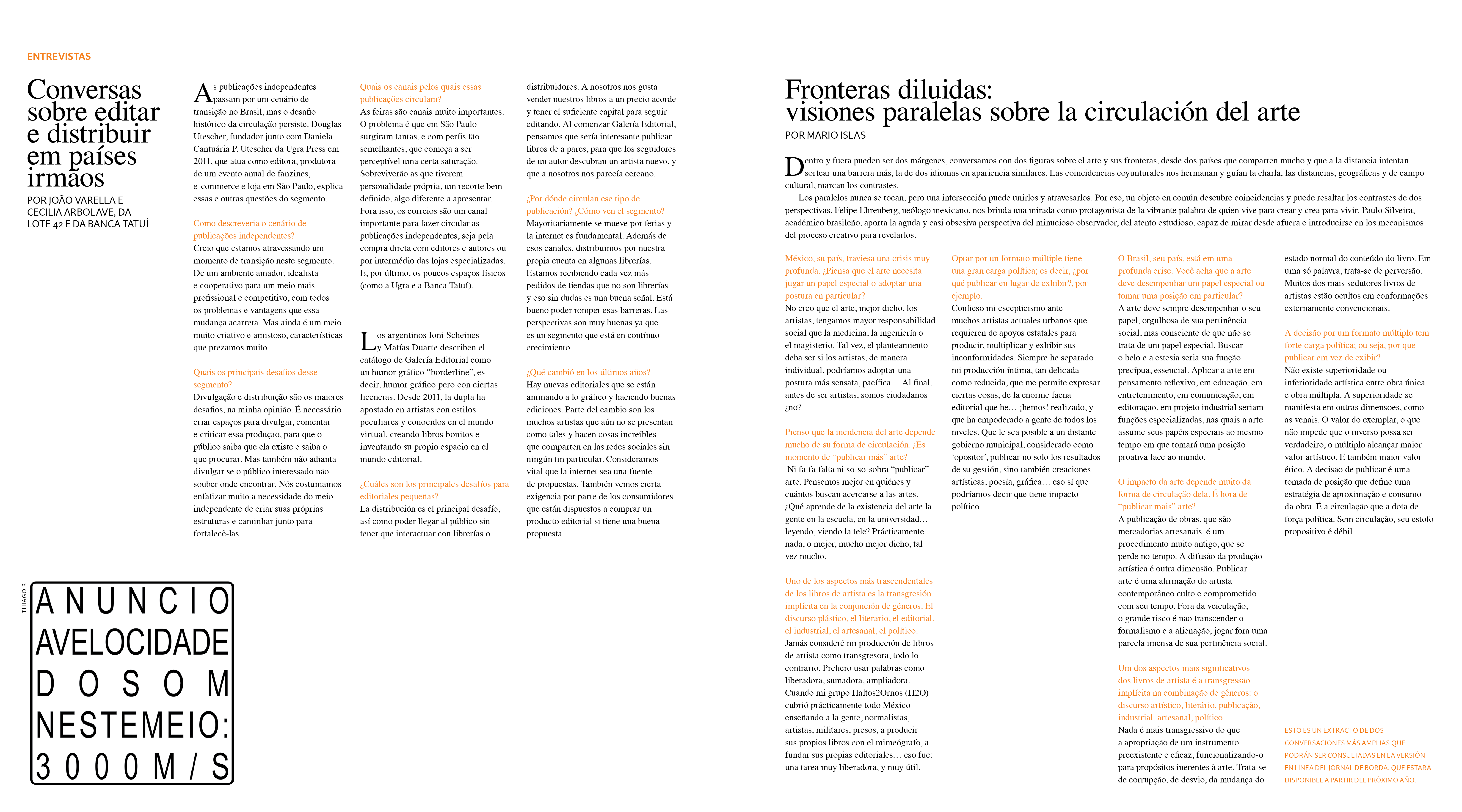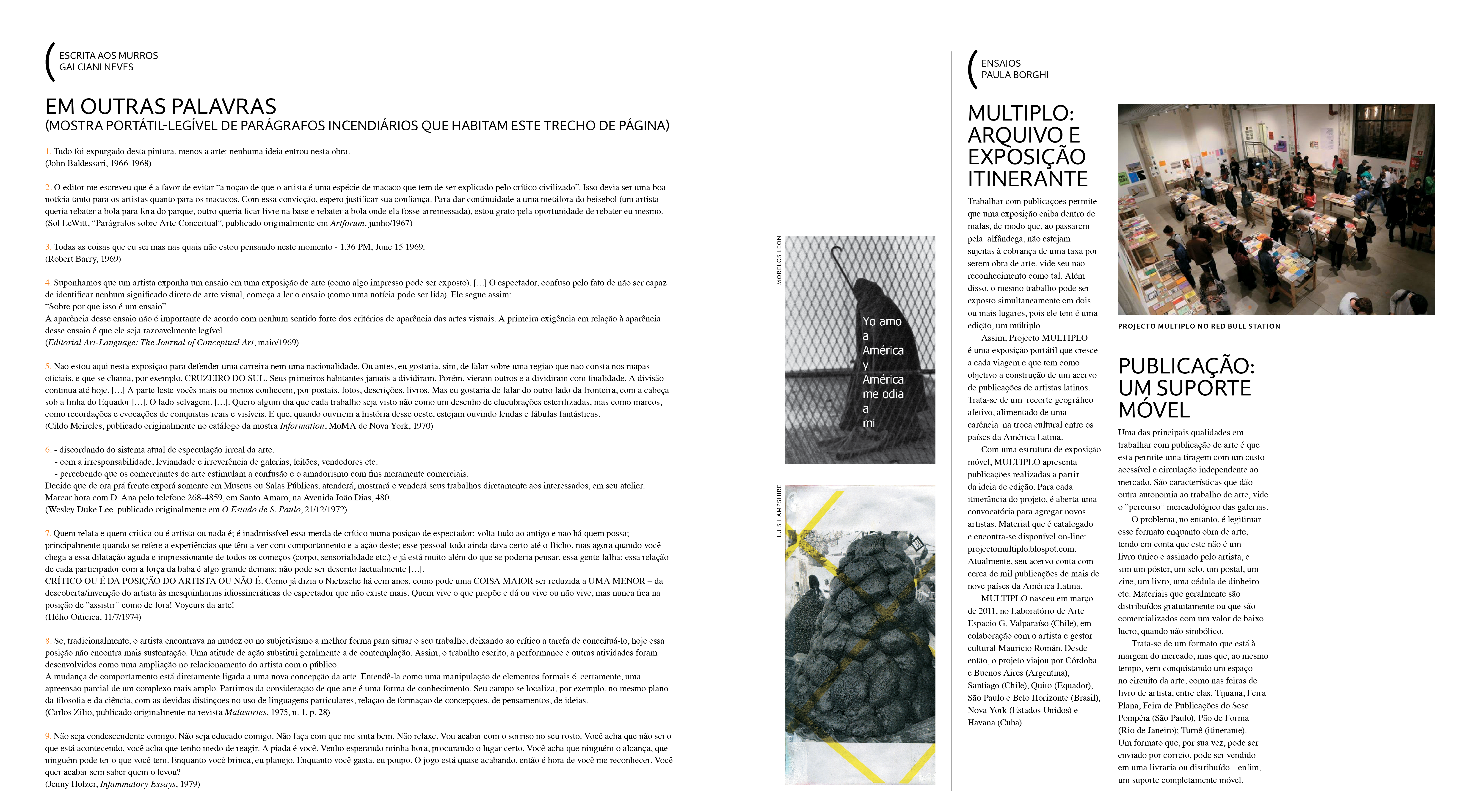 A segunda edição é de 16 páginas e conta com contribuições do Brasil, México e Argentina. Artistas das mais diversas linguagens foram convidados a produzirem anúncios, são 14 anúncios espalhados pelo jornal. A homenageada da edição é Regina Melim, e Amir Brito Cadôr fecha com um trabalho na última página do jornal. Outra novidade são as entrevistas. Os entrevistadores foram ao encontro de pesquisadores e artistas que são referência para o debate sobre livros, jovens artistas e editores atuantes no mercado editorial independente, tanto no Brasil quanto na Argentina e no México. Mario Islas conversou com Paulo Silveira e Felipe Ehrenberg e Laura del Rey, com Camila Otto e Guilherme Gerais. Já Cecilia Arbolave e João Varella falaram com Douglas Utescher, Ioni Scheines e Matías Duarte. Os colunistas seguem com seus espaços. Fábio Morais, nosso colunista itinerante, assumiu a capa do Jornal desta vez, retirando dela qualquer vínculo com a factualidade da notícia. Paula Borghi traz a experiência do seu projeto curatorial em publicações (Projecto Multiplo). A artista Raquel Stolf põe em página um experimento de publicação, a pesquisadora e fotógrafa Lívia Aquino segue com seu guichê de apontamentos poéticos, a curadora e pesquisadora Galciani Neves traz suas referências em arte, e o fotógrafo Felipe Russo fala do trabalho de André Penteado. Não podemos esquecer que viajamos até Portugal com o pessoal do evento O que um livro pode. A artista e professora Isabel Baraona escreveu um pouco sobre o evento naquele país. Ela tem muita coisa bacana pra dizer pra gente do lado de cá. [Compre a versão impressa aqui].